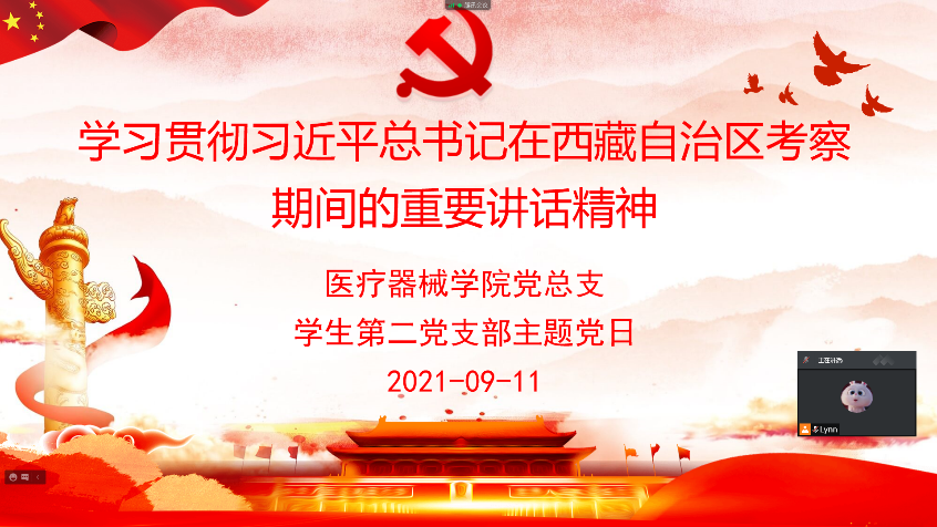 2021年9月11日上午,医疗器械学院学生第二党支部通过腾讯会议平台开展主题党日活动,在线围绕习近平总书记在西藏自治区考察期间的重要讲话精神,认真传达学习、开展学习研讨,推动学习贯彻工作入脑入心、走深走实。会议由学生第二支部书记荀琳同志主持,荀琳同志首先对近期党史学习教育工作提示做了梳理和传达,强调学习教育与中心工作“同频共振”,从党史学习教育中汲取智慧力量,真正把学习成效转化为工作成效、发展成效。