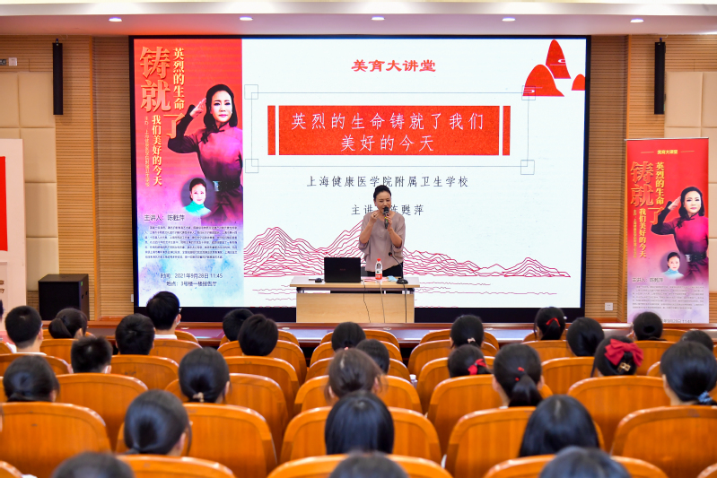 陈甦萍老师以“英烈的生命铸就了我们美好的今天”为主题,铺展了一堂满满正能量的美育讲堂。英烈赵一曼既是英雄也是母亲,她把对孩子的爱转化为对这片土地的爱。在沪剧《赵一曼》中,一张赵一曼与儿子的合影照片贯穿全剧,她把对儿子的思念与爱,扩展到全中国每一位孩子身上。赵一曼临上刑场时,饱含深情地给儿子写下了最后的诀别信。为了更多的孩子能过上幸福的生活,她义无反顾地血染山林,把自己31年短暂生命献给了东北的白山黑水,献给了中国人民的解放事业。
