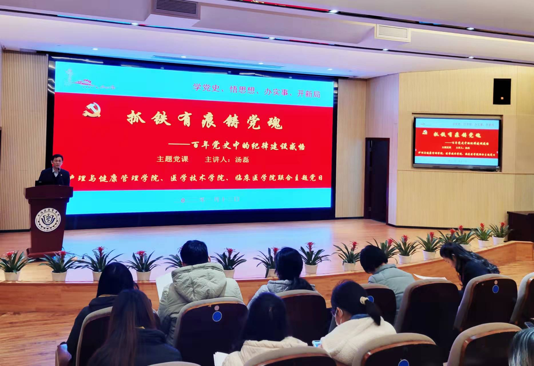 1月13日下午,护管、医技和临床医学院党总支在北苑1号楼200人报告厅联合举办《百年党史中的纪律建设感悟》主题党日,护管学院党总支书记汤磊做主题党课,医技学院党总支书记刘敏娟和临床医学院党总支书记蔡巧玲做交流发言,三个学院的师生党员和理论学习中心组成员共同参加了学习,此次活动由汤磊主持。
