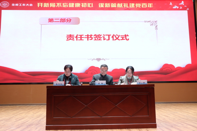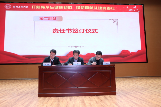 教务处处长王莉、学生处副处长(主持工作)吕晓丽代表职能部门与黄钢签订2021年学校重点工作任务责任书。