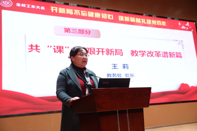 教务处处长王莉以“共‘课’时艰开新局,教学改革谱新篇”为题作了发言,她表示,新的一年,部门将以学分制改革为突破口,重塑专业人才培养体系,以提升质保体系能级为路径,助推人才培养高质量发展,在推进教育教学改革中彰显新担当,交出新答卷,展现新作为。