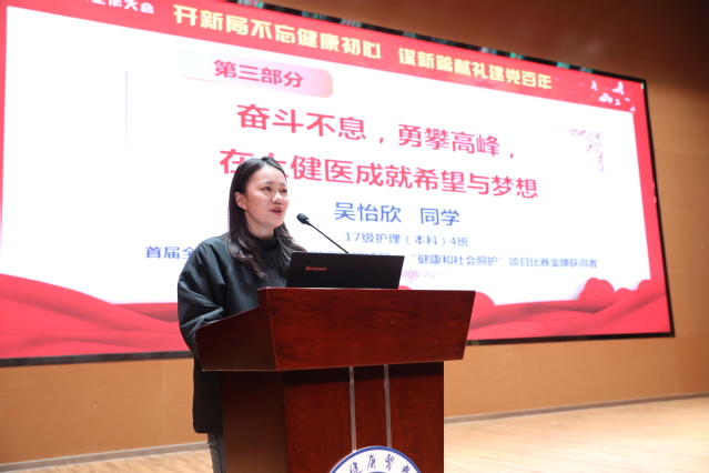 首届全国职业技能大赛世赛选拔项目——“健康和社会照护”项目比赛金牌获得者、17级护理(本科)4班吴怡欣同学以“奋斗不息,勇攀高峰,在上健医成就希望与梦想”为题分享了获奖的经历和体会,她表示,自己会将比赛中所学、所思、所想应用在临床一线,真正为病人带去温暖,努力向着国家队发起冲锋,更向着技能高峰勇敢攀登。