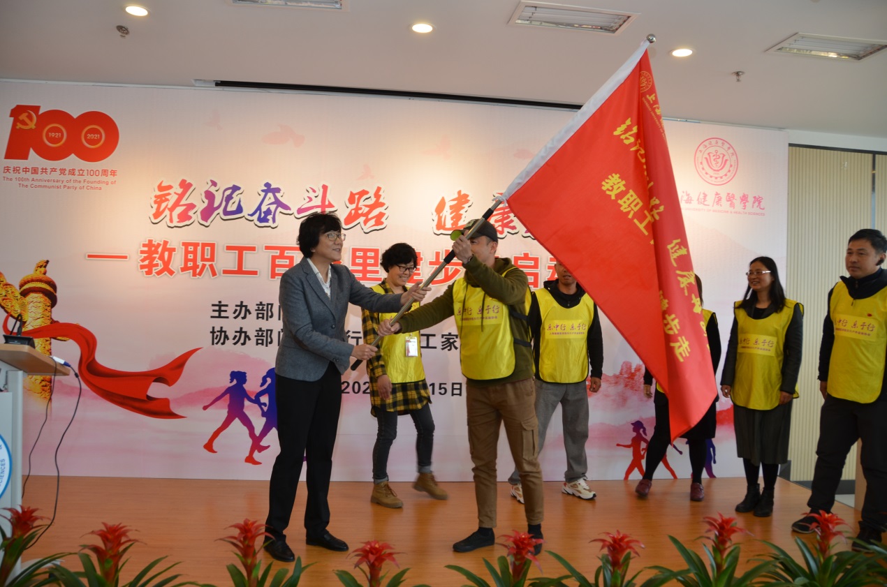 校工会常务副主席凌文惠主持仪式并介绍庆祝建党百年系列活动。启动仪式上,于莹为活动承办的乐行户外运动协会授旗,感谢协会的组织者与积极参与各项建党百年活动老师的倾情投入、真心付出。她表示,举办健步走活动,是为了铭记历史,展望未来,用百公里健步走开启系列活动的意义非凡,致敬百年建党艰苦卓绝的路程,开启新百年中华民族伟大复兴、梦想的征程。不忘初心、方得始终,始于足下,从今天出发,宣传动员广大教职工乐中行、乐于行、开步健步走,开步新生活,开启新开局,以饱满的热情、昂扬的斗志庆祝中国共产党成立一百周年!