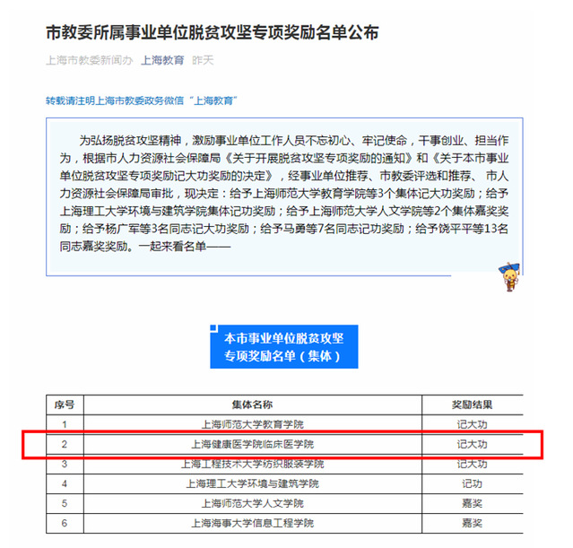 本次评选是根据上海市人力资源和社会保障局《关于开展脱贫攻坚专项奖励的通知》和《关于本市事业单位脱贫攻坚专项奖励记大功奖励的决定》,经学校推荐、市教委评选和推荐、市人力资源和社会保障局审批,永利集团88304官网临床医学院与上海师范大学教育学院、上海工程技术大学纺织服装学院等3个集体被记大功奖励。