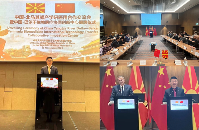 11月18日,驻北马其顿使馆举办中北马政产学研医用合作交流会暨中国—巴尔干生物医药协同创新中心揭牌仪式,张佐大使、斯科普里副市长特拉亚诺夫斯基、校长吴韬、奥赫里德信息和科技大学代表马宁诺等出席并致辞,多地市长、中北马企业、高校、媒体等各界代表170余人出席。张大使表示,中北马双方将在两国领导人战略引领下,共同促进政产学研医用一体化发展交流合作,使发展成果更多惠及两国人民。特拉亚诺夫斯基盛赞中国式现代化成就,欢迎更多中国高校、企业与北马开展合作。吴校长表示,学校愿加强与北马教育、科技合作与交流,积极推进中国长三角和巴尔干半岛在生物医药等领域对接。来宾们共同见证了中国长三角—巴尔干半岛生物医药国际技术转移协同创新中心揭牌仪式。