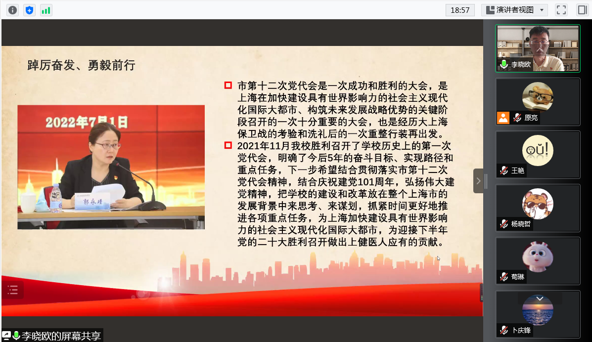接着,李晓欧传达了7月1日校党委理论学习中心组(扩大)学习会精神,校党委郭永瑾书记指出“2021年11月永利官网胜利召开了学校历史上的第一次党代会,明确了今后5年的奋斗目标、实现路径和重点任务,下一步希望结合贯彻落实市第十二次党代会精神,结合庆祝建党101周年,弘扬伟大建党精神,把学校的建设和改革放在整个上海市的发展背景中来思考、来谋划,抓紧时间更好地推进各项重点任务,为上海加快建设具有世界影响力的社会主义现代化国际大都市,为迎接下半年党的二十大胜利召开做出上健医人应有的贡献”,吴韬校长强调“学习宣传贯彻市第十二次党代会精神,是当前和今后一个时期的重要政治任务。全校师生要深刻理解和准确把握市第十二次党代会的精神实质,以强烈的政治责任感和使命感认真学习领会,深刻理解把握,精心谋划部署。我们要以‘时时放心不下’的责任感,知重负重、坚韧不拔,向最好者看齐、与最强者比拼、跟最快者赛跑,加快推进学校教学科研等各项工作快速发展,为大踏步推进高水平应用型医学院校建设贡献力量,以实际行动和优异成绩庆祝建党101周年和迎接党的二十大的胜利召开”,这激励着学院教师要踔厉奋发、勇毅前行。