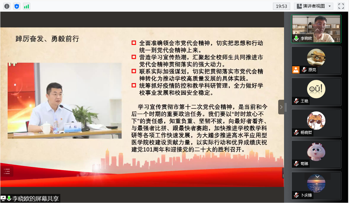 7月2日,医疗器械学院党总支通过线上组织召开中心组(扩大)会议,专题学习贯彻市第十二次党代会精神,学院党总支委员、各党支部书记、团总支书记、教研室主任、科级干部、工会主席及各党支部委员等参加会议,会议由学院党总支李晓欧书记主持。
