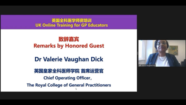 RCGP Valerie Vaughan Dick女士发言表示英国皇家全科医师学院(RCGP)对此次中国项目的再次启动非常重视,期望通过本项目可以促进中国全科医师师资能力的提升,推动全科医学培训基地的标准化、国际化发展。