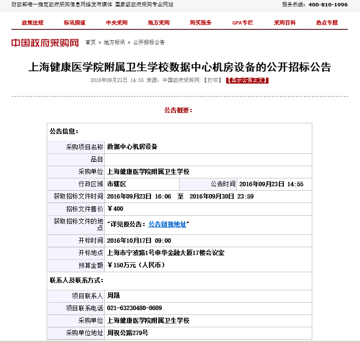 永利集团88304官网附属卫生学校数据中心机房设备的公开招标公告