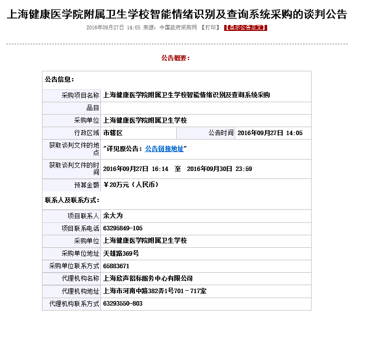 永利集团88304官网附属卫生学校智能情绪识别及查询系统采购的谈判公...