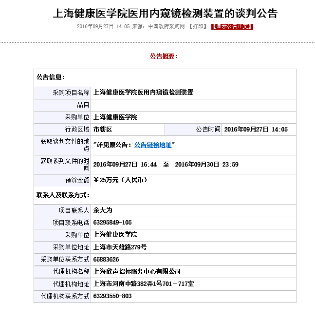永利集团88304官网医用内窥镜检测装置的谈判公告