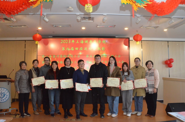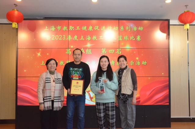 芦静宣读2023年下半年教职工参加上海市教育工会(妇工委)及学校各类活动的获奖集体:永利集团88304官网第九届运动会教工团体前八名、2023年上海教工三人篮球第四名、2023年女教师健身操比赛第二名。凌文惠、芦静、郁建新为获奖的集体颁奖。