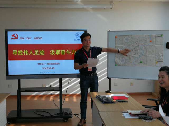 首次党史学习教育在学院党总支刘敏娟书记的指导下,经支委酝酿讨论,确定了主题为“寻找伟人足迹,汲取奋斗力量”。为达到创新理论学习思路,体现学习特色的目的,并增加参与感,要求人人找地图,人人讲故事,寻找中国共产党基层组织或个人当年在上海的活动地点、遗址和革命活动内容,跟随伟人在上海的足迹,勾勒共产党人在艰苦奋斗岁月的立体图景,绘画红色文化基因地图。党支部12位党员每人都要进行3-5分钟演讲介绍。为体现特色增加吸引力,活动还提供上海地图、小红旗和小照片,供大家瞻仰提升感性认识。