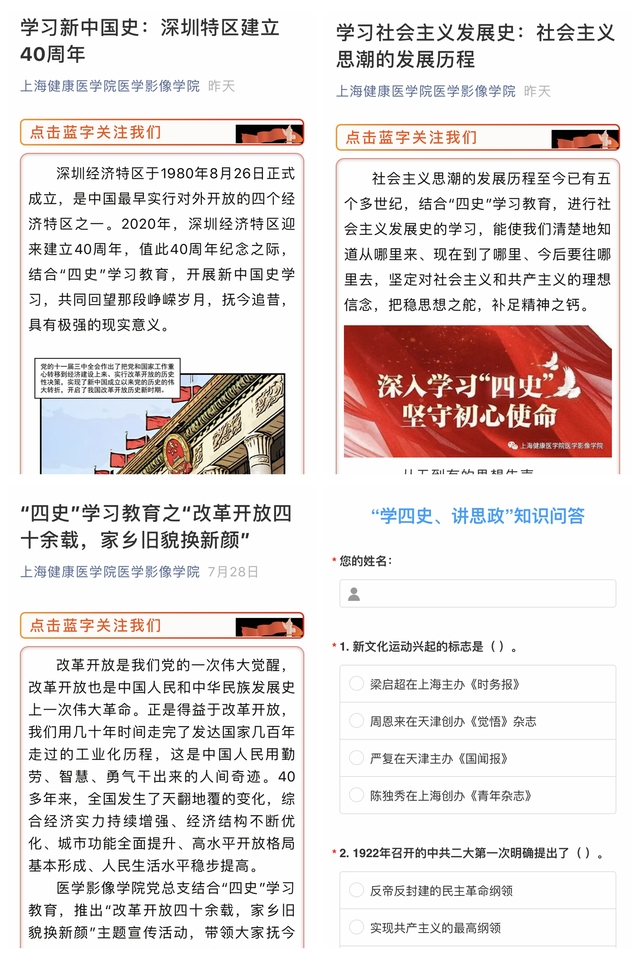 依托学院网站和微信公众号,推出“四史”学习教育之“改革开放四十余载,家乡旧貌换新颜”、“学习新中国史:深圳特区建立40周年”、“学习社会主义发展史:社会主义思想发展历程”专题宣传及“学四史、讲思政”线上知识问答,使全院教师抚今追昔,了解时代发展,感受社会变迁,通过学习党史、新中国史、改革开放史、社会主义发展史以及课程思政等相关知识,增强学院“四史”学习效果,让每一位教师感知在学习上所存在的不足,为下一阶段的“四史”学习教育奠定良好基础。