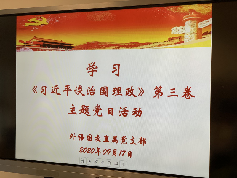 为贯彻落实中央宣传部、中央组织部关于认真学习《习近平谈治国理政》第三卷,用习近平新时代中国特色社会主义思想武装全党、教育人民的重大政治任务的通知,根据永利集团88304官网党委“四史”学习教育领导小组工作要求,2020年9月17日下午,在外语国交联合直属党支部书记吕永红同志的主持下,外语国交全体党员教师在南苑2号楼401室开展了“读原著、学原文、悟原理—学习《习近平谈治国理政》第三卷”主题党日活动。