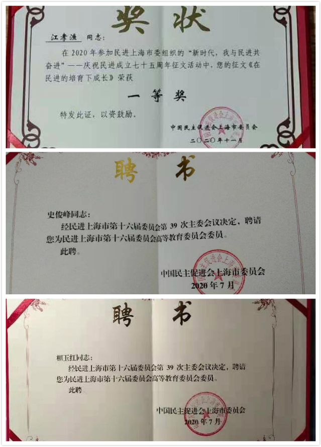 永利官网民进支部向民进市委递交了6篇社情民意,其中5篇被民进市委录用;积极参与民主监督,4人次参加了中共上海市委委托民进市委组织开展的对长宁区、青浦区“一网通办,一网统管”工作的专项民主监督;3位会员通过激烈的竞争,在民进市委专委会的届中增补中脱颖而出,分别成为高等教育委员会委员和基础教育委员会委员;在民进市委组织的“新时代,我与民进共奋进”——庆祝中国民主促进会成立75周年征文中,1篇征文获得一等奖。
