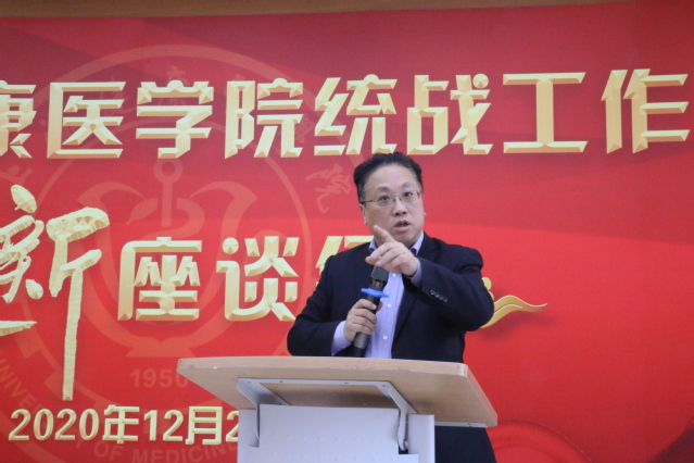 黄钢校长通报了2020年学校重点工作。他指出,2020年是“极不平凡的一年”,在全校教职工的共同努力下,学校事业发展取得了丰硕的成果,在“服务全市防疫大局,抗击新冠肺炎疫情”、“健全人才培养体系,提升人才培养质量”、“服务国家整体战略,促进健康服务业发展”、“科学谋划“十四五”规划及校园建设”、“服务保障第三届中国国际进口博览会”等方面取得了重要进展。他表示,过去一年,党外人士同全校教职工一起携手拼搏、兢兢业业,为学校发展作出了重要贡献。希望在新的一年里,进一步形成统战工作合力,积极引导广大统战成员在事业上展示新气象、实现新作为。